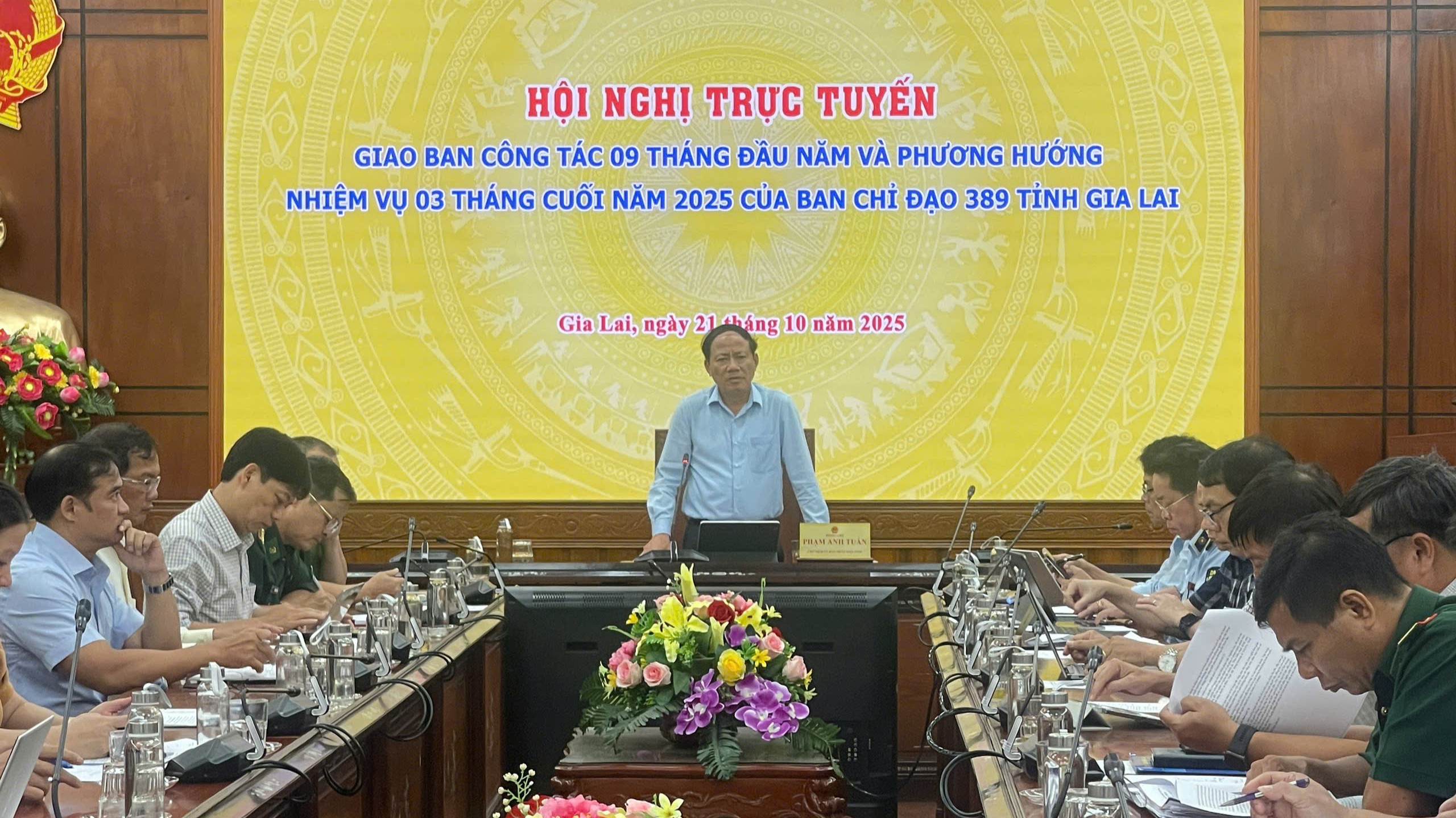 Chiều 21/10/2025, Ban Chỉ chống buôn lậu, gian lận thương mại và hàng giả tỉnh Gia Lai (Ban Chỉ đạo 389 tỉnh Gia Lai) tổ chức Hội nghị Giao ban công tác 09 tháng đầu năm và triển khai nhiệm vụ 3 tháng cuối năm 2025. Tham dự hội nghị có các đồng chí lãnh đạo là thành viên Ban Chỉ đạo 389 tỉnh. Đồng chí Phạm Anh Tuấn - Phó Bí thư Tỉnh ủy, Chủ tịch Ủy ban nhân dân tỉnh, Trưởng ban Chỉ đạo 389 tỉnh chủ trì Hội nghị.