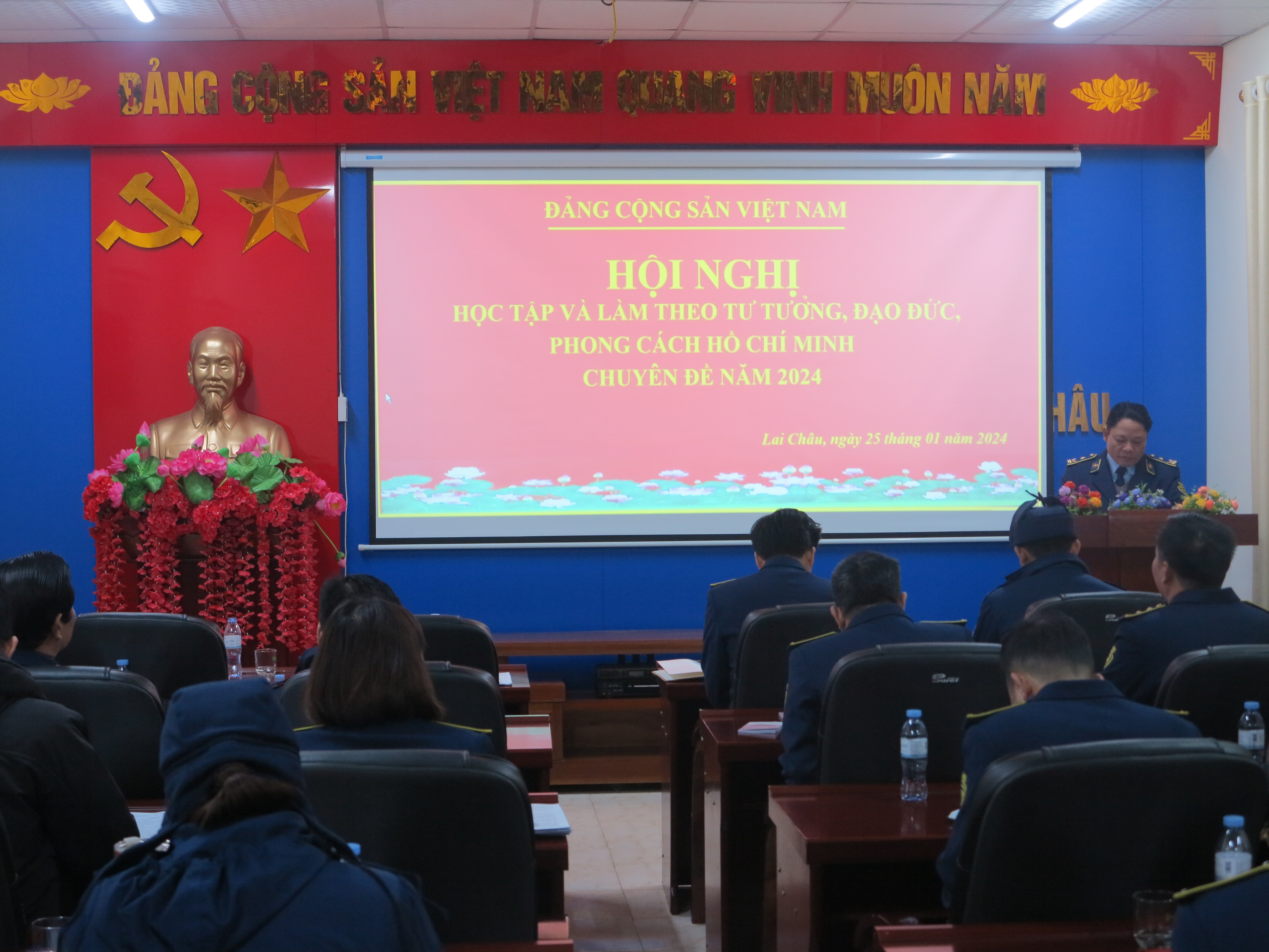 Thực hiện Kế hoạch số 211-KH/ĐU ngày 12/01/2024 của Đảng ủy Cục Quản lý thị trường tỉnh Lai Châu về việc thực hiện kết luận số 01-KL/TW của bộ chính trị về tiếp tục thực hiện chỉ thị số 05-CT/TW về “đẩy mạnh học tập và làm theo tư tưởng, đạo đức, phong cách hồ chí minh” và học tập, quán triệt, tuyên truyền chuyên đề năm 2024. Ngày 25/01/2024 các đảng viên, công chức và người lao động Cục Quản lý thị trường tỉnh Lai Châu đã được nghe đồng chí Đinh Văn Thành - Phó Bí thư Đảng bộ Cục Quản lý thị trường tỉnh Lai Châu quán triệt Chuyên đề năm 2024: “Học tập và làm theo tư tưởng, đạo đức, phong cách Hồ Chí Minh về phát huy quyền làm chủ của Nhân dân, đẩy mạnh đổi mới sáng tạo, khơi dậy khát vọng xây dựng cuộc sống ấm no, hạnh phúc, đưa Lai Châu phát triển nhanh và bền vững”.Gắn với đẩy mạnh công tác giáo dục chính trị, tư tưởng cho cán bộ, đảng viên, kết hợp chặt chẽ giáo dục chủ nghĩa Mác - Lênin, tư tưởng Hồ Chí Minh với giáo dục rèn luyện phẩm chất đạo đức, lối sống nâng cao đạo đức công vụ của công chức Quản lý thị trường trong thực hiện nhiệm vụ chính trị được giao.